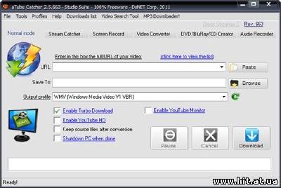 [center][]  [/][/center] Многофункциональное приложение, при помощи которого можно скачивать видео с таких ресурсов, как YouTube, Видео@Mail.ru, MySpace, Dailymotion, Megavideo, Google, MTV, Metacafe, Spike, Yahoo! и многих других (свыше 200 сайтов), а затем конвертировать загруженные файлы в различные форматы с возможностью их воспроизведения на ПК или мобильных устройствах (IPAD, IPOD, PSP, GPS устройства, MP3- и MP4 плееры, сотовые телефоны, Android-коммуникаторы, DVD, VCD, Iphone). Кроме того, программа обладает инструментами для прожига CD/DVD дисков, захвата аудио и видео, что позволяет делать полноценные презентации и обучающие семинары. Ключевые особенности aTube Catcher: - Большое количество поддерживаемых форматов, включая 3GP, 3G2, AVI, XVID, MP4, MP3, MP2, WMA, WMV, GIF, FLAC, WAV, PSP, MPG, VOB, OGG, MOV и др.